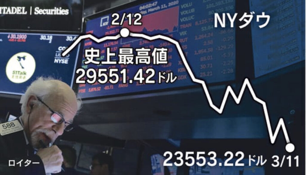 新型コロナウィルスの影響で連日の株価下落、日経平均は直近の高値24,115円(1月17日)から18,339円(3月12日)-5,776(-24%)、ニューヨークダウの市場最高値29,551ドル(2月12日)から21,335ドル(3月12日取引時間中現在)-8,216ドル(-28%)とパニック... -